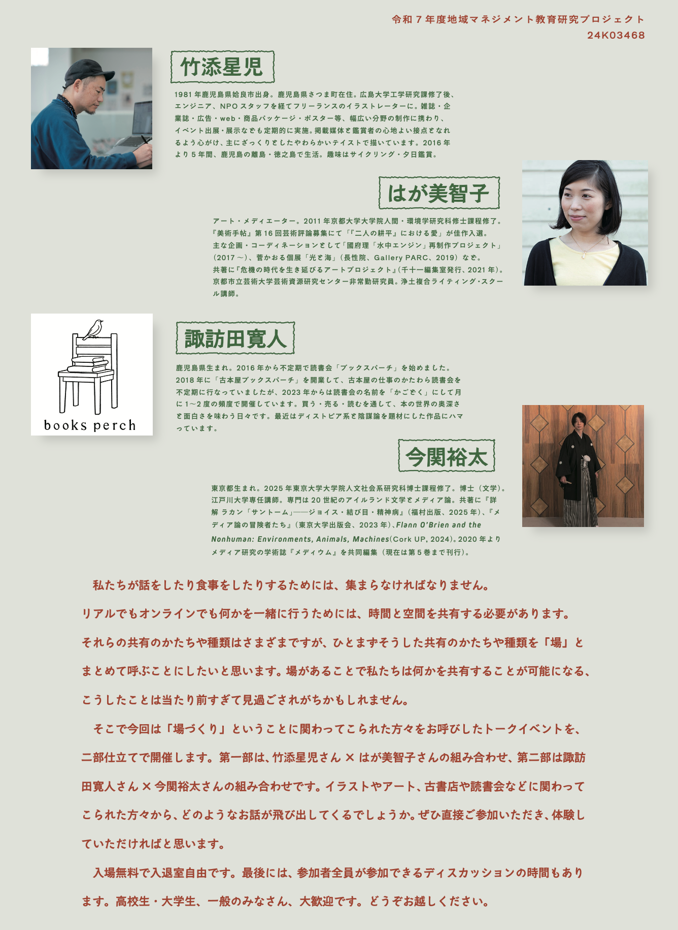 二部構成で、第一部の登壇者は鹿児島で活躍するイラストレーターの竹添星児さんと、京都でアート・メディエーターとして活動するはが美智子さんです。第二部の登壇者は、鹿児島市内で古書店ブックス・パーチを営む諏訪田寛人さんとアイルランド文学研究者の今関裕太さんです。