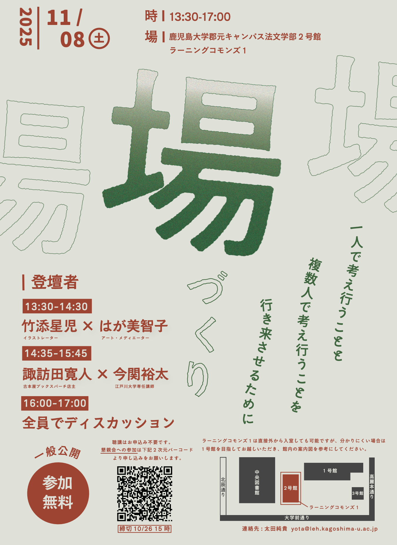 11/8(土)の13:30-17:00に、ラーニングコモンズ1(郡元キャンパスの法文学部2号館)で、「場づくり」と題したイベントを開催します。
