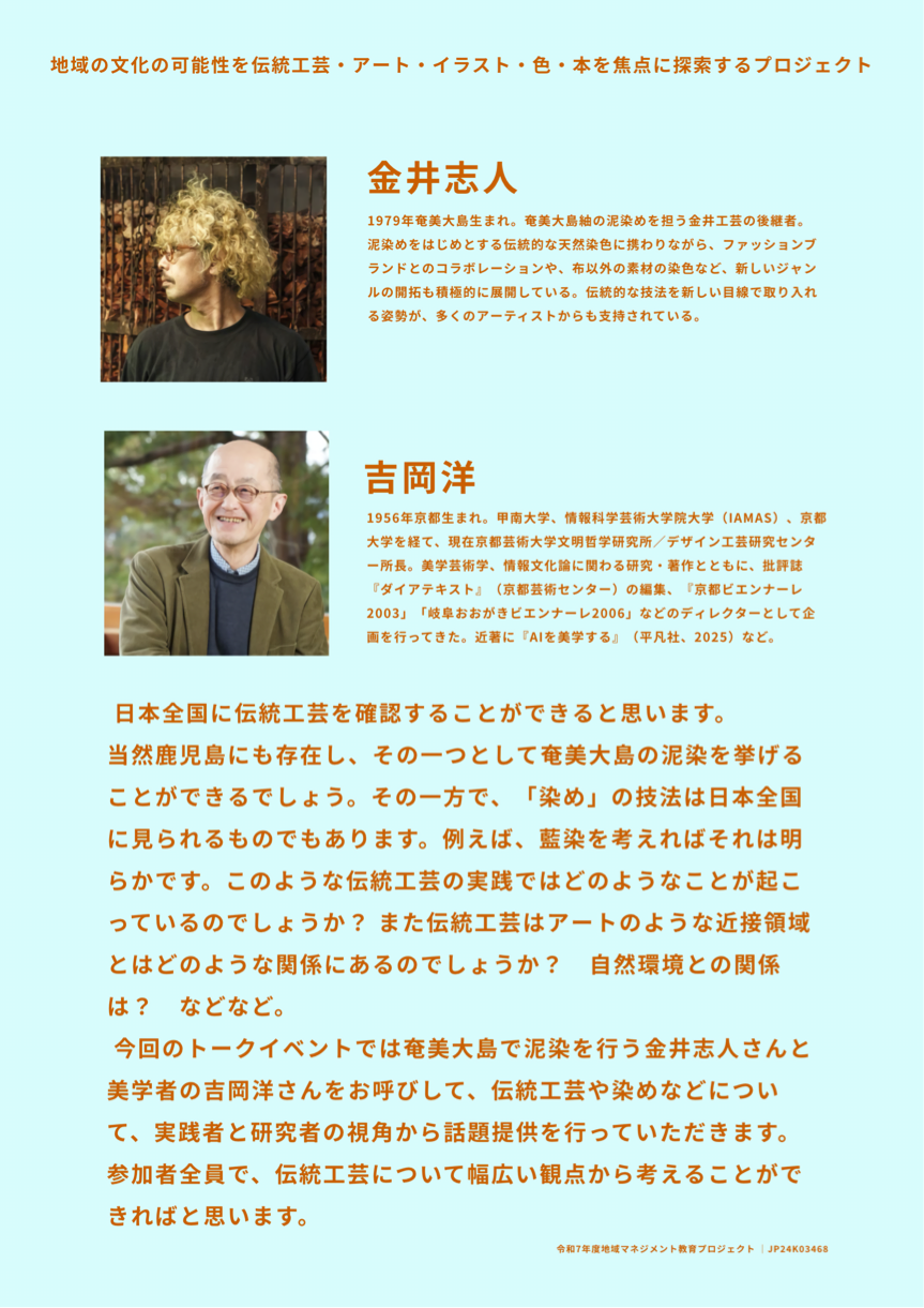 話題提供者は、染色家の金井志人さんと哲学者・芸術研究者の吉岡洋さんです。金井さんは金井工芸の代表で奄美大島で泥染を手がけるとともに、様々な分野の方々とコラボレーションをされておられます。吉岡さんは『AIを美学する』などの著作のある研究者で、最近では藍染のプロジェクトにも参加されています。美学は哲学の一分野として進展し、芸術研究とも深い関係にあります。